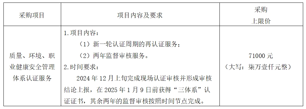 2024年12月上旬完成現(xiàn)場認證審核并形成審核結(jié)論上報,在2025年1月9日前獲得“三體系”認證證書,其余兩年的監(jiān)督審核按照時間節(jié)點完成。服務期限內(nèi),如中標人未能按照合同條款約定履行合同義務,采購人有權提前終止合同(具體以簽訂合同為準)。