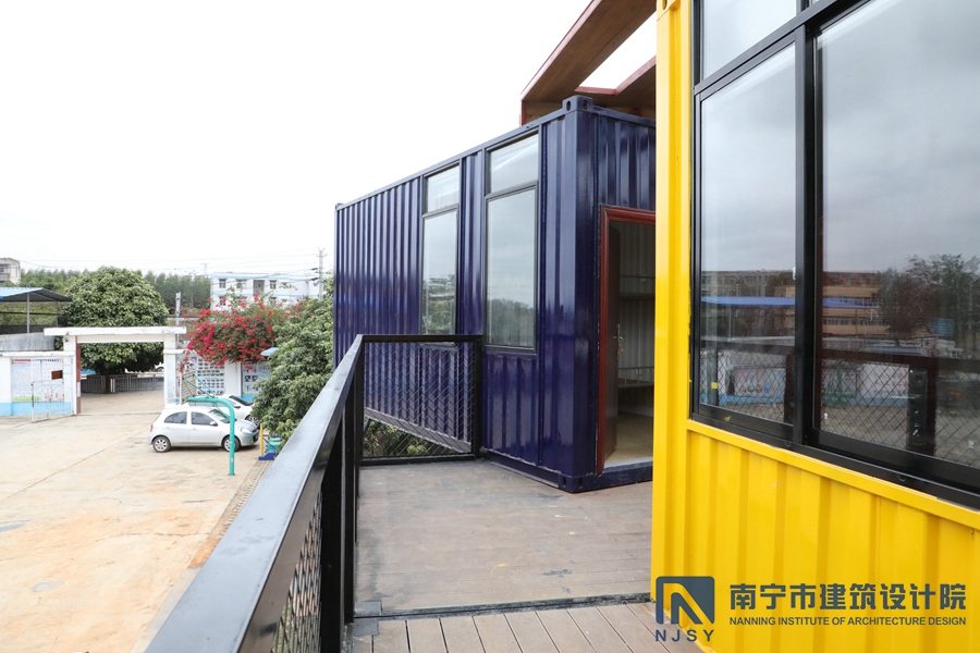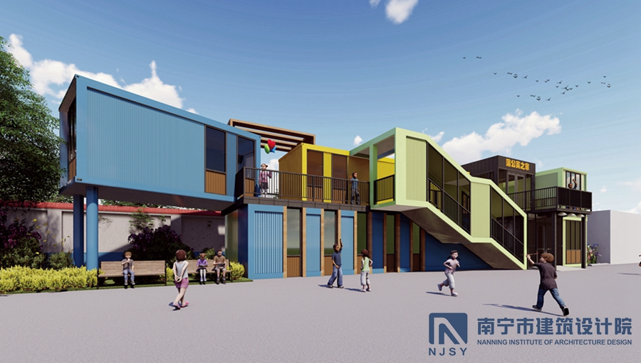 項目采用了集裝箱房屋的形式,由10個集裝箱構(gòu)成,通過堆積木的形式,根據(jù)學生兒童所需的建筑風格和功能需求,將集裝箱橫豎排列,形成一定的退臺和露臺空間,為孩子們提供更多共享活動空間。